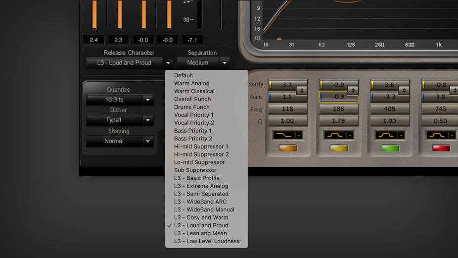 No hay nada como el L3-16. Fusionando EQ paramétrico y control de dinámica, las pantallas informativas muestran 16 bandas virtuales, con la respuesta representada por tres curvas discretas: atenuación, EQ y prioridad. Y todo está bajo un control intuitivo, gracias a un conjunto de controles de EQ paramétrico familiar.
