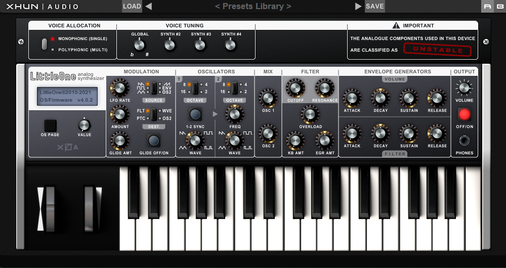 Además de la simulación de toda la ruta de señal, cada componente dentro de LittleOne (osciladores, filtro, envolventes, LFO ...) presenta las respuestas de frecuencia y rangos originales del contraparte de hardware, produciendo un sonido profundo, rico y cálido.