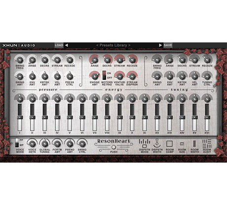 Construido como un instrumento virtual mediante el uso de técnicas de modelado físico (ACS), ResonHeart debe considerarse como una máquina acústica nacida de componentes mecánicos, bombas de aire, motores, válvulas neumáticas y bloques de resonadores complejos (uno por voz). Cada bloque de resonador consiste en un conjunto de dieciséis resonadores de Helmholtz universales (que pueden ser activados y afinados individualmente) dispuestos en una disposición característica de síntesis modal. Este diseño particular hace que ResonHeart sea genuinamente capaz de imitar el peculiar sonido de una amplia gama de sistemas acústicos, incluyendo percusiones y platillos basados en cuerpos rígidos o membranas - una de las cosas más difíciles de simular utilizando modelado físico.