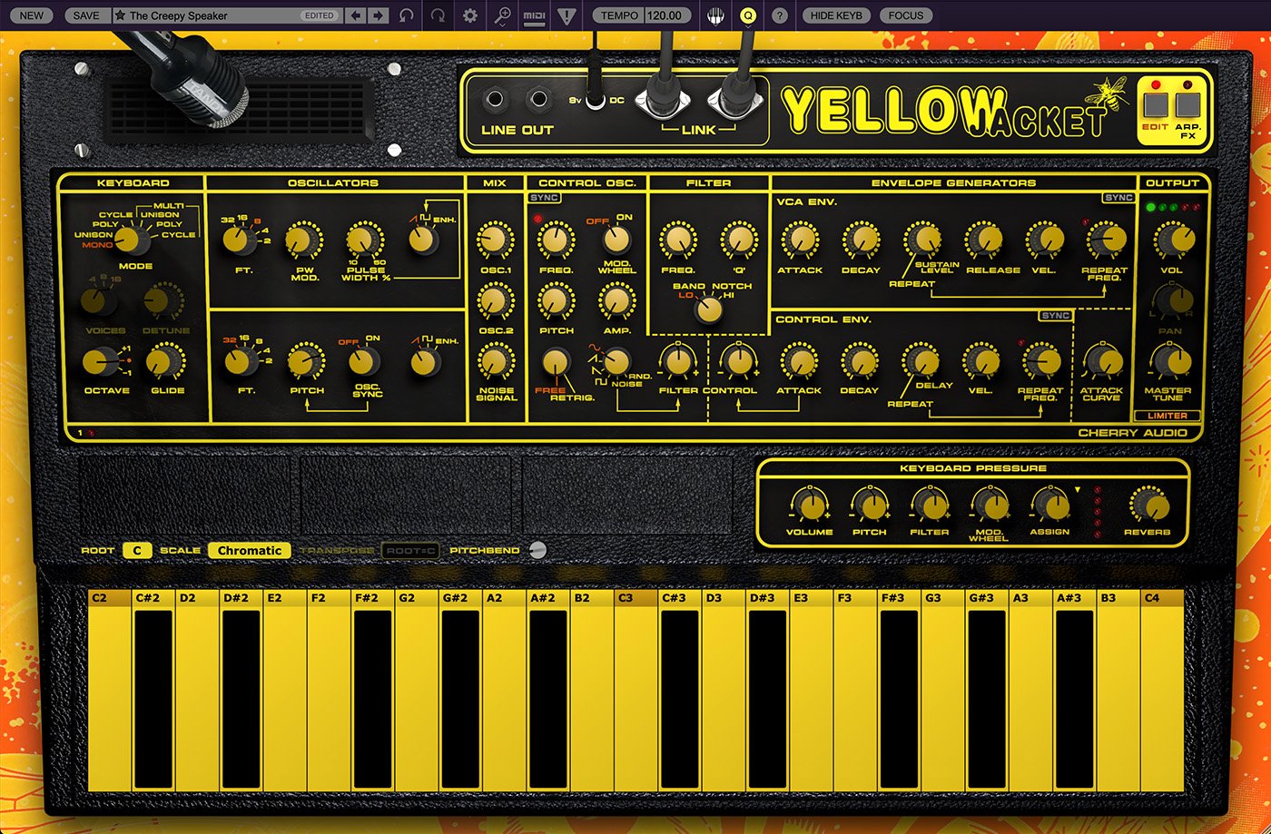Cherry Audio ha replicado la apariencia del notorio teclado táctil capacitivo amarillo y negro del original, lo ha mejorado con escalas diatónicas y transposición, y lo ha ampliado con control de presión personalizable con soporte para aftertouch expresivo en canal y polifónico. Quizás la característica más emocionante de Yellowjacket está directamente inspirada en el innovador sistema pre-MIDI de EDP que permitía encadenar múltiples sintetizadores: modos multivoz que añaden "mini sintetizadores" ajustables que pueden proporcionar variaciones sutiles o extremas en el tono, acordes de un solo dedo y patrones arpegiados, efectos estéreo exuberantes y más.